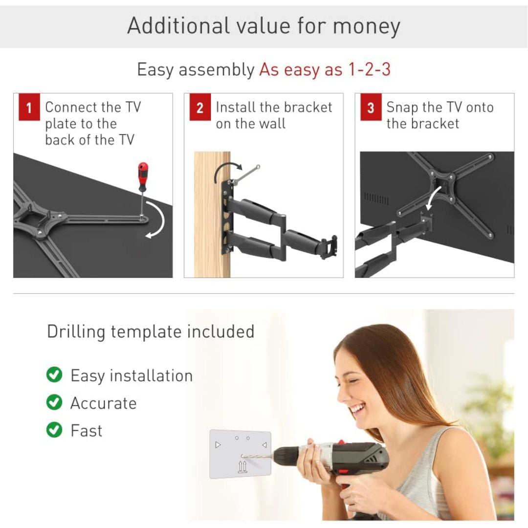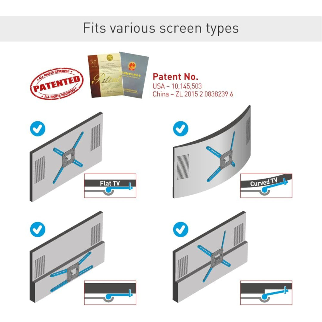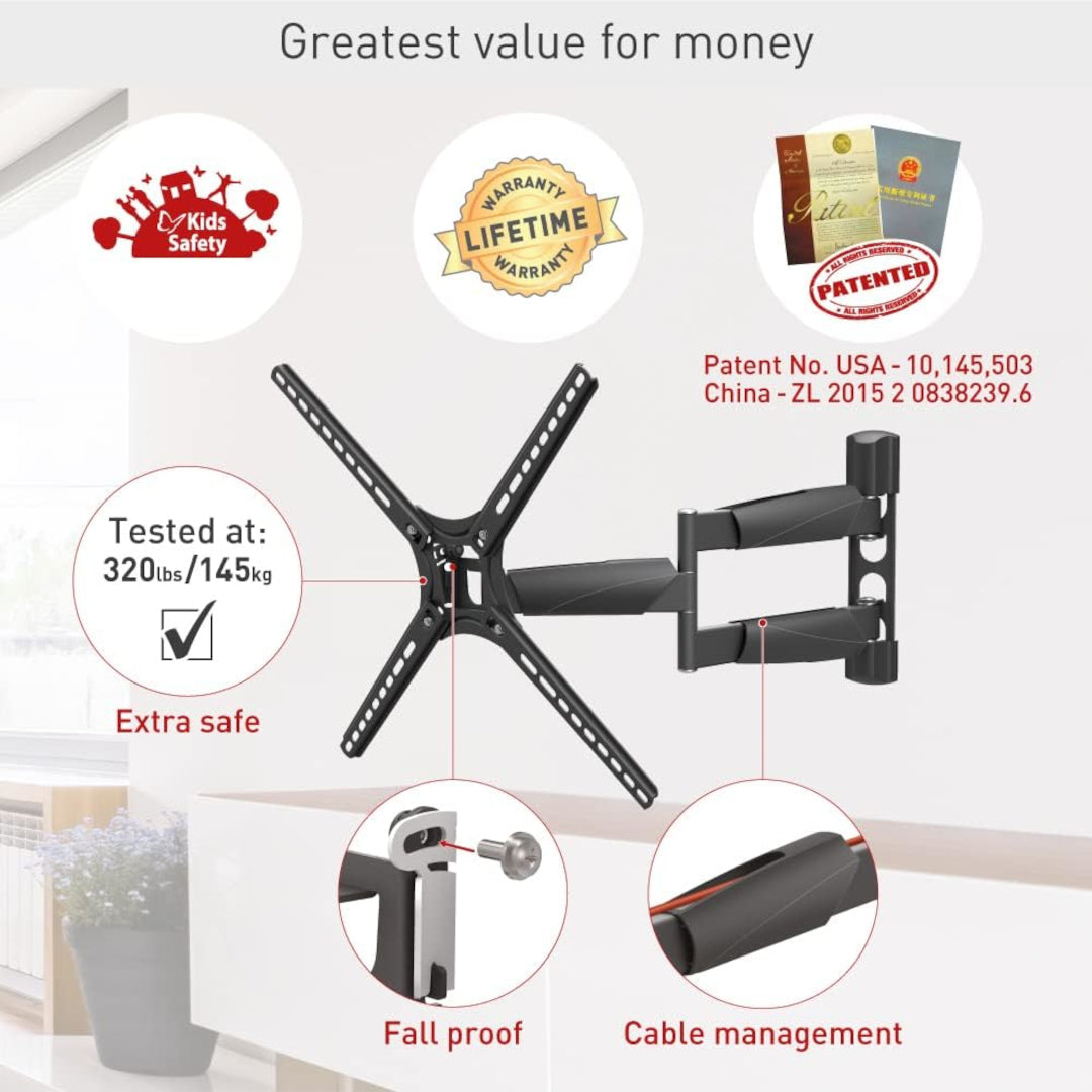 • EXTRÊMEMENT EXTENSIBLE - Distance minimale du mur - 2,9", Distance maximale du mur - 21". Permet de visualiser à partir de divers endroits et de placer l'écran au coin d'un mur. Les bras extensibles ont des cache-câbles pour donner au support un look prestigieux lorsqu'il est étendu.