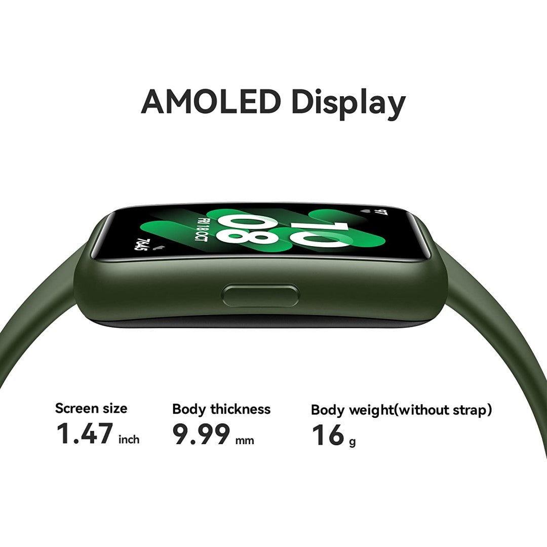 - HUAWEI Band 7 is super light weight with a 1.47" screen size which wraps around the wrist with ease. Ultra-narrow bezels outline the content onscreen, drawing attention to the services and features you love. The band's stunning AMOLED FullView Display seems to float on air, sitting atop a highly-breathable strap.