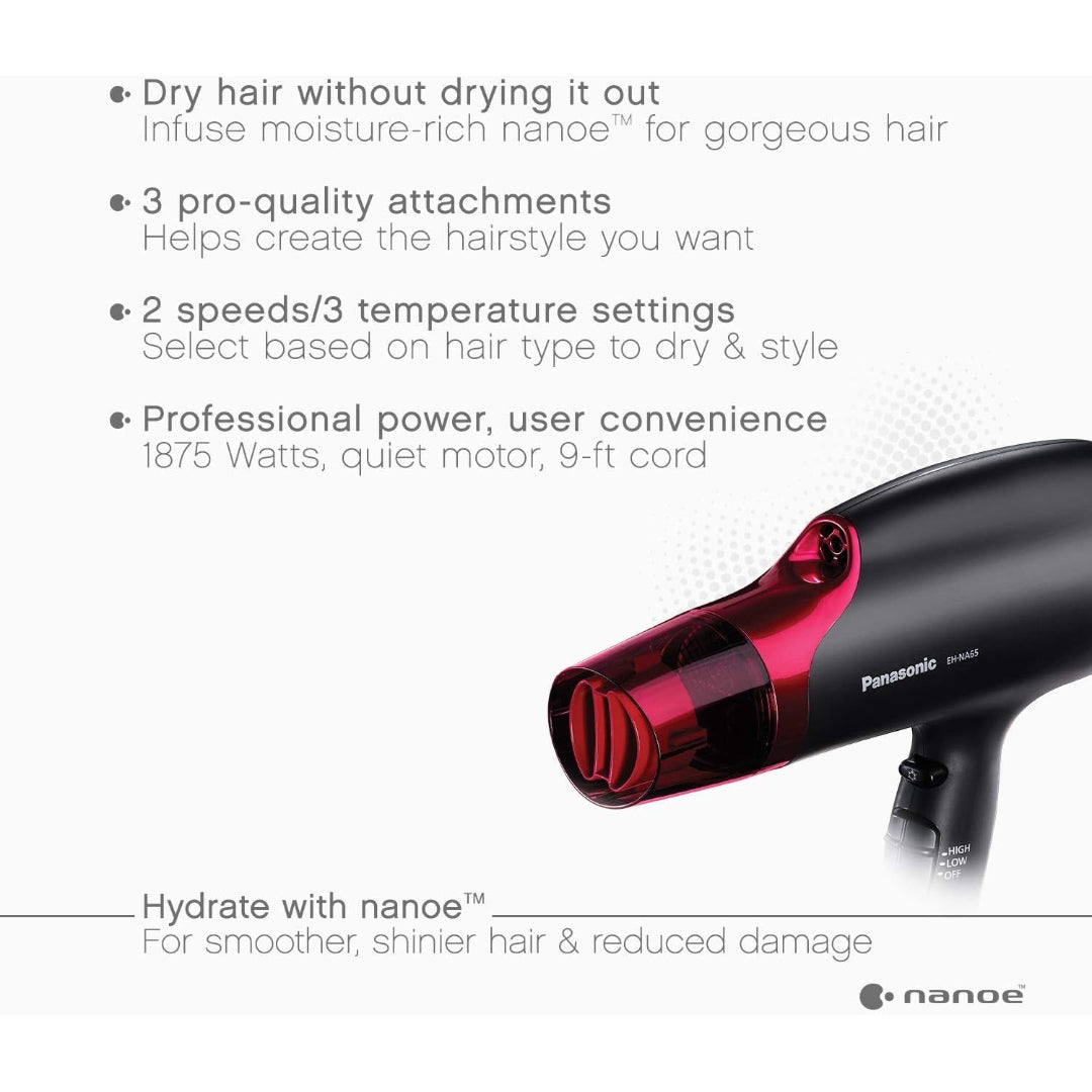 Panasonic Ehna65k Moisture Infusion Nanoe Hair Dryer With 3 Attachments, Pink, Matte Black & Pink, 950 Grams