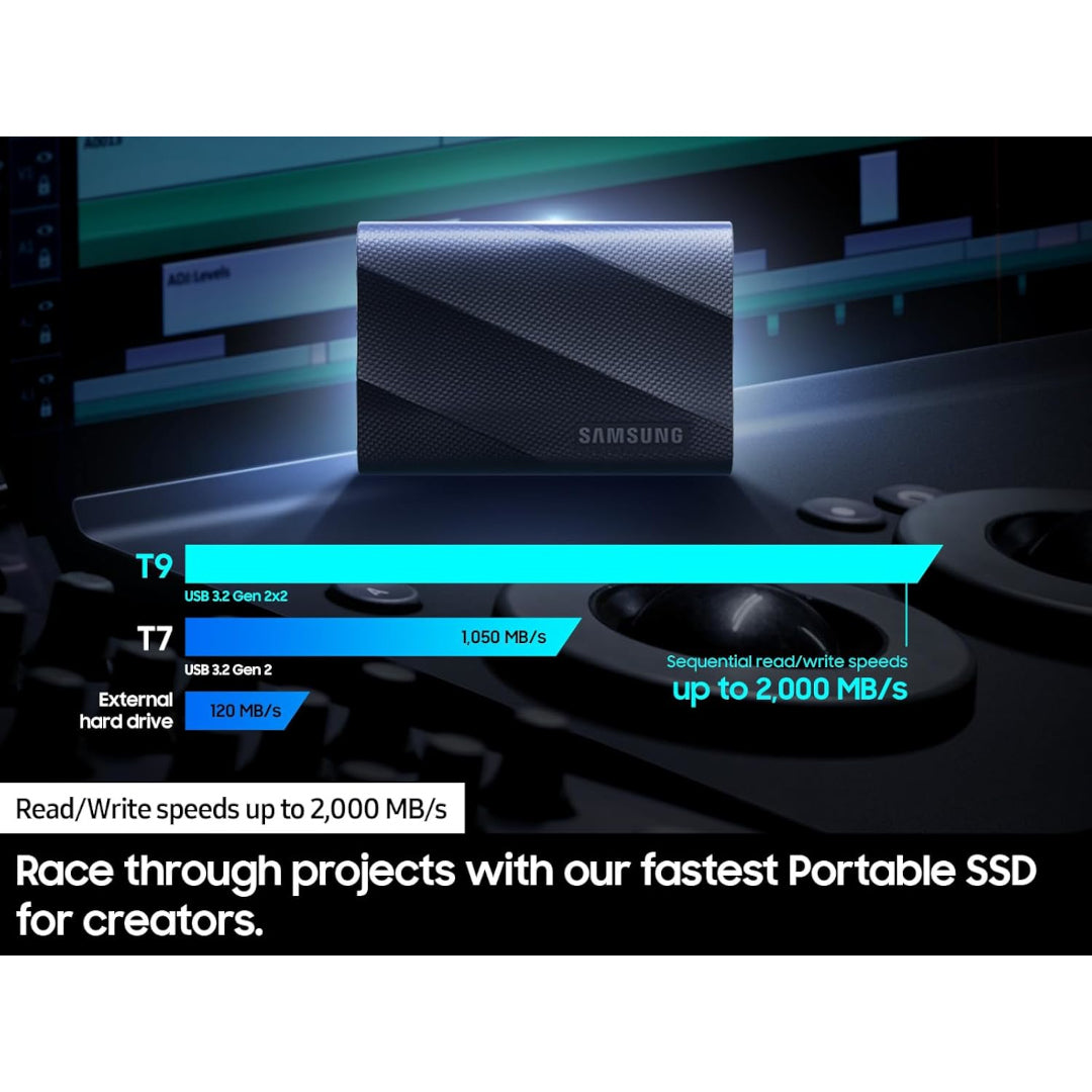 - Time saved, workflow boosted - With USB 3.2 Gen 2x2 interface and utilizing the NVMe protocol, the T9 can transfer a 2GB file in almost 1 second achieving sequential read/write speeds of up to 2,000 MB/s. Save the loading time and get more done with a compact device that speeds up your workflow and productivity.