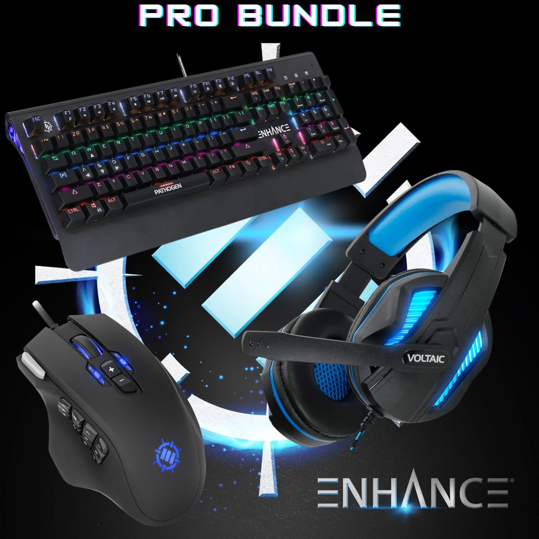 Enhance products are designed to take your gaming experience to the next level. From beginners to competitive enthusiasts, Enhance aims to provide peripherals that enlighten gamers and facilitate excellence across all genres. This bundle contains headphones, a keyboard, and a mouse.