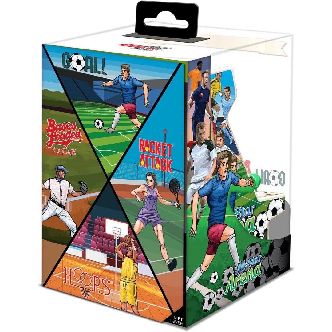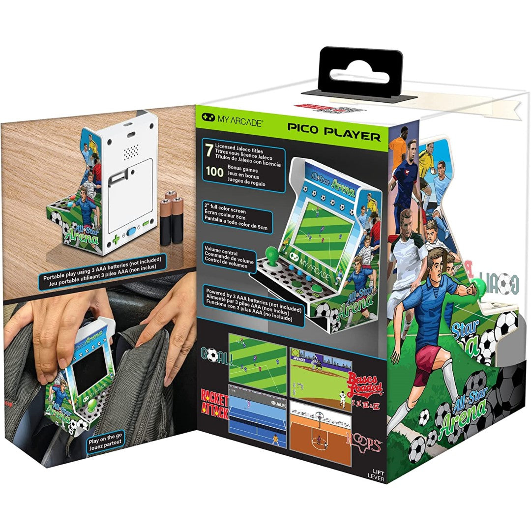 Includes fully playable versions of GOAL!™, BASES LOADED™ 1,2,3 & 4, RACKET ATTACK™ and HOOPS™. The All-Star Arena Pico Player features a full color 2” screen to brightly display all 7 titles and is fine-tuned for hours of play through its emphasis on ergonomics and compact design.