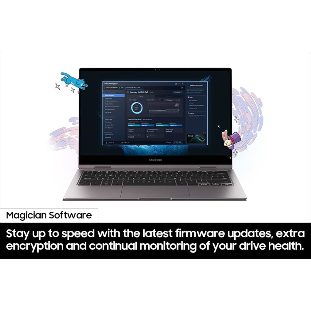 - ALWAYS UP TO DATE VIA MAGICIAN SOFTWARE: It’s not hocus pocus. Your 990 EVO SSD performs like new with the always up to date Magician Software. Stay up to speed with the latest firmware updates, extra encryption and continual monitoring of your drive health it works like a charm.